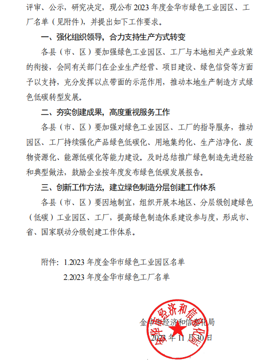 近日,為更好助力金華市工業(yè)領(lǐng)域“雙碳”工作,開展美麗金華建設(shè)、“無(wú)廢城市”創(chuàng)建等工作。金華市經(jīng)濟(jì)和信息化局開展“2023 年度金華市綠色工業(yè)園區(qū)、工廠”申報(bào)工作。我司 “浙江杭機(jī)股份有限公司”獲評(píng)“2023 年度金華市綠色工廠”。